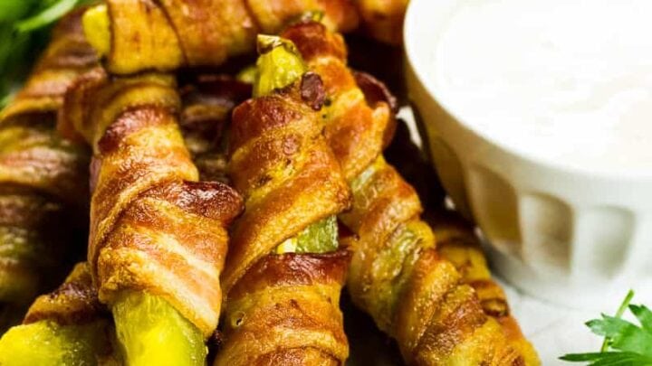Pickles wrapped in bacon that get super crispy are the ultimate side dish for wings. Along with homemade ranch dressing, you won’t be able to stop eating them!
