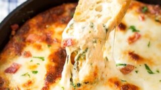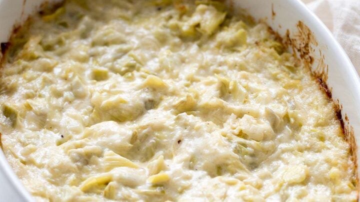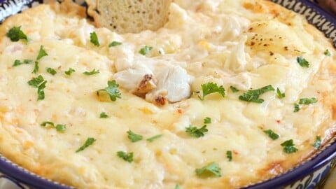 There’s just something about rich, creamy artichoke dip made with artichoke hearts, mayo, and parmesan cheese. This is one dip that disappears almost instantaneously!