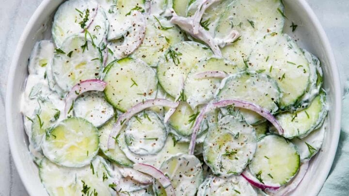 Fresh herbs, sour cream, and onions make this creamy cucumber salad stand out as one of those great side dishes. It’s also quick and easy, making for a fast way to feed a crowd.