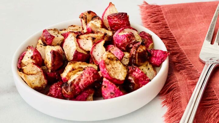 For the perfect low-carb side for corned beef and cabbage, these air-fried radishes are wonderful. These crispy bites are seasoned for a flavorful potato alternative everyone will enjoy.