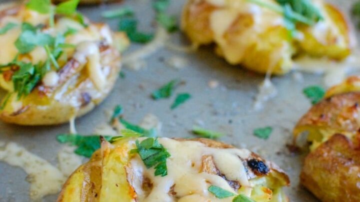 Golden potatoes are drizzled with olive oil and garlic and baked until crispy and then topped with gouda and warmed until the cheese is toasty and melted. Gouda smashed potatoes are the perfect holiday side dish that will impress your guests. Add some rye bread to the meal, and you've got a great spread.
