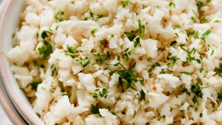 While cheesy cauliflower rice is a perfect side dish, making it with garlic and parmesan also matches beautifully with fish. You can make it by using a fresh cauliflower head or cheat and use the riced cauliflower from your freezer.