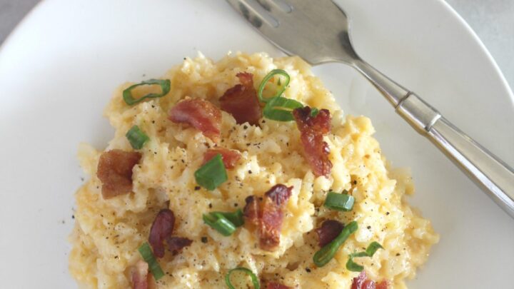 If you have frozen cauliflower rice, you can whip up cheesy cauliflower rice in a pinch. This cheesy side dish is a splendid way to fill up your family along with that fresh haddock.
