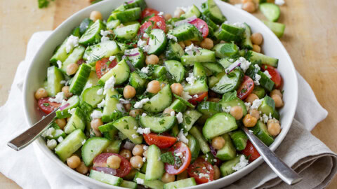 For haddock, mahi mahi, and other types of fish, cucumber salad is always a match. This recipe adds chickpeas, red onion, tomatoes, and feta to make it disappear even more quickly from everyoneโs plates.ย