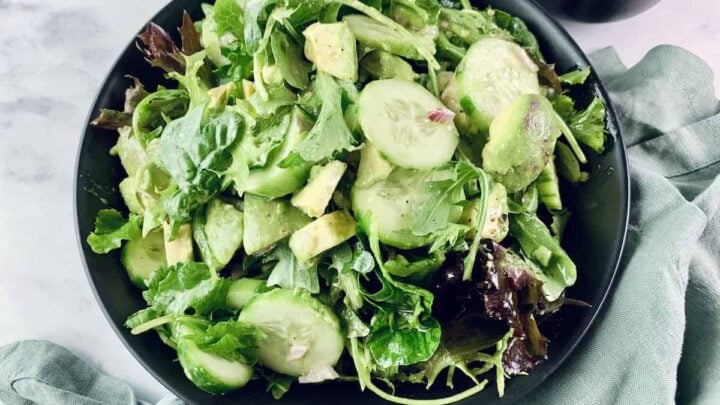 Or, if youโve already settled on a potato side dish, choose a Greek salad. You canโt go wrong with that bounty of cucumber, olives, avocados, and feta cheese mixed together with a perfect Greek salad dressing!