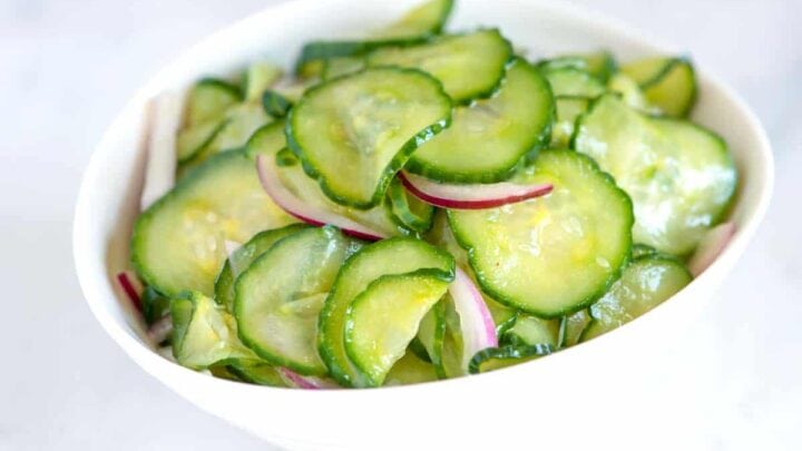 Go with a Greek cucumber salad, and you can’t go wrong. It brings all those elements of a Greek salad with cucumbers as the focus.