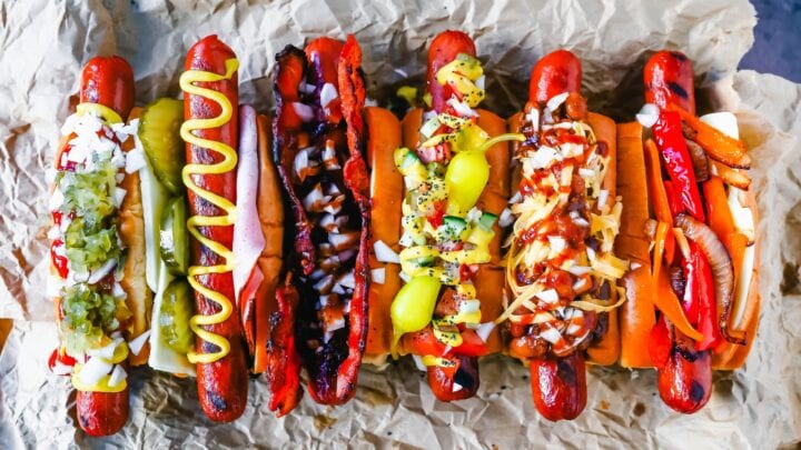 Classic hot dogs are always a match when you need something to serve with hamburgers, especially when you’re hosting a large gathering of friends and family. Gourmet toppings can elevate the experience and allow guests to top them off their way too.