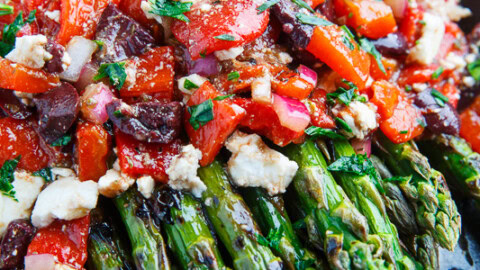 An elegant side for burger night, grilling asparagus along with roasted red peppers is a different and exciting flavor. Add kalamata olives and feta, and this is one side dish you’re going to want to make all the time.