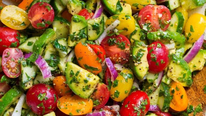 Creamy avocado is the star of this avocado salad. With tomatoes, red onions, and an array of colorful, healthy veggies, you’ll be eating all the right foods.