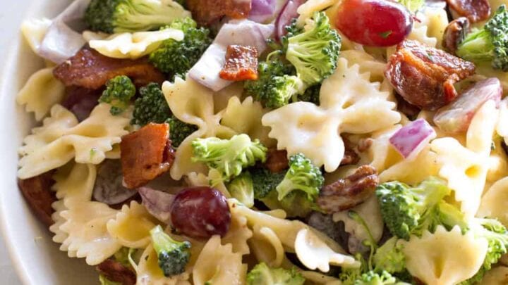 Cute little bowtie pasta shapes are a match with broccoli and grapes. It’s both sweet and savory and utterly refreshing when you need healthy burger sides.