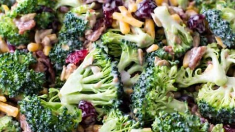 Sugar Spun Run has a broccoli salad with some flavor-filled ingredients. The salad features crunchy raw broccoli, creamy mayo, cranberries, crumbled bacon, and plenty more good things.