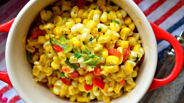 One of the great things about corn is that you can make it in a large variety of ways, including this recipe with red peppers, green onions, black pepper, and a few more ingredients that will make you want to grab a big spoon.